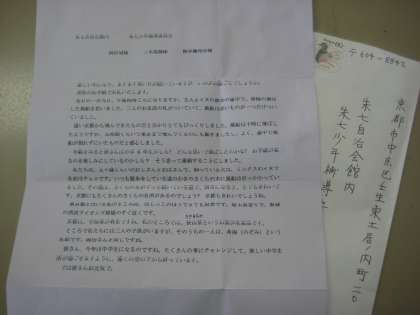 1月9日に新春子供大会が行われ,そのとき風船をとばしたのを覚えておられるでしょうか?その返事が届いたのです。それも,なんと東京から!その手紙を紹介します。