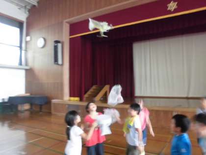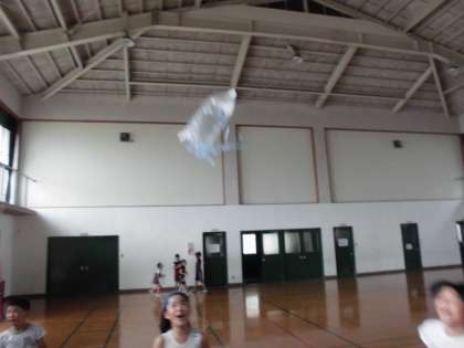 「ふんわりふわふわ」の作品を持って,体育館で飛ばしました。下から送風機で風を当てたり自分の口で吹いたりしながらみんなで楽しみました。中には,思いの他高く上がり,驚きの声を挙げている子ども達もいました。