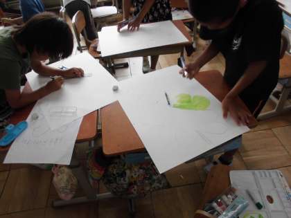 総合的な学習の時間(きらり)で学習したことをどのように発信していこうと話し合ったところ,「ポスターをかきたい。」という意見が出ました。そして,「きらりポスター」という名前も子ども達から出てきました。緑を大切にしたいという思いを込めてそれぞれにポスターをかいています。