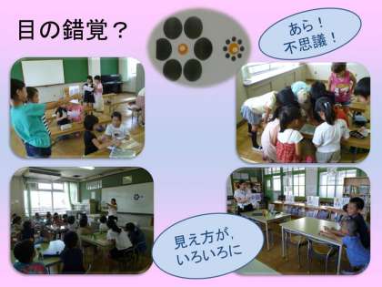 まず,取り組んだのは「首ふりドラゴン」です。切って,折って,のりではっていくのに,けっこう時間がかかってしまいました。1・2年生の子ども達も,一生懸命です。先生にも助けてもらいながら,「ドラゴン」が完成。これが不思議な「ドラゴン」で,へこんでいるのですが,じっと見ていると浮き出て見えるのです。そして,首をふっているように動き出す・・・という不思議なものです。これは,目の錯覚(錯視)によるものなのです。他にも,目の錯覚で不思議に見えるものをいくつか体験することができました。