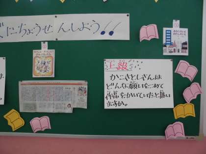 「ニュースを読んで,クイズにちょうせんしよう!」を掲示しています。作家かこさとしさんについてのクイズです。ふと立ち止まって,クイズの答えを考える子どもたちの姿も。子どもたちが読書に親しむ中で,お好きに入りの作家と出会えるといいですね。