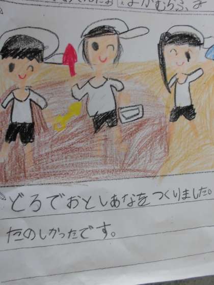 昨日,生活科「なつだ,とびだそう!」の学習で,砂場で泥だらけになって活動したことを今日はワークシートに絵と文で表現しました。とても楽しかったようで,みんないきいきと表現していました。
