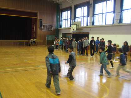 1月26日(水),中間休み体育館で,3くみによる「ブーメラン大会」がありました。3くみの子どもたち手作りのブーメランを決められた場所から飛ばします。はじめは難しいけど,コツが分かればグングン飛んでおもしろい!大きい子も小さい子も何度も並んで挑戦していました。