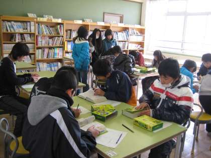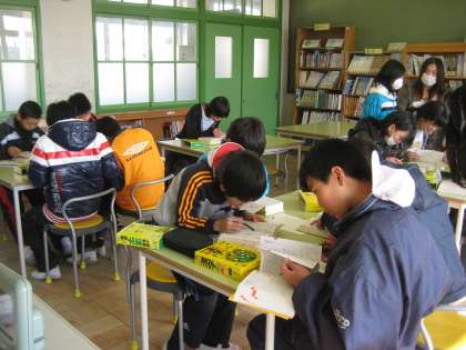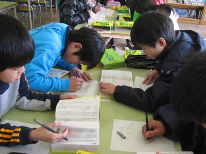 みんな真剣です。あせるとなかなかページがめくれません。国語辞典を使って3つの言葉を調べる速さを競いました。