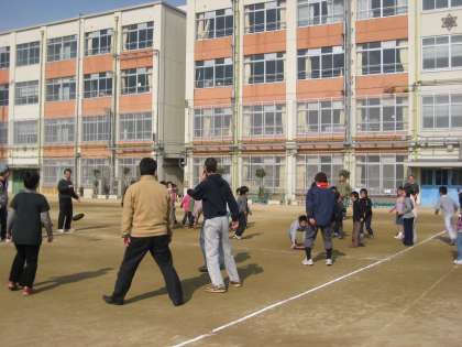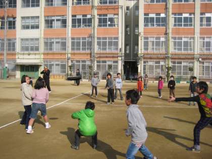はじめに少しフリスビーの練習をした後,さっそく低学年と高学年に分かれて試合開始です。高学年のコートでは,すごい勢いでフリスビーが飛び交っています。一方低学年の方は,はじめ投げ方も分からず,なかなか思うように飛ばせなかったのですが,やっているうちにどんどんうまくなっていきました。