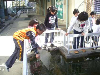 学校の二つの池には,子ども達が経験したことのない2cmもある氷が張り,1年生がそっと足をおろしても,割れませんでした。昼休みには,少し解け始めた氷を持ち上げ,五感を働かせて楽しんでいます。