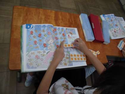 1年算数では,「20までのかず」の学習が始まりました。教科書の絵を見て,数えたい海の生き物の上に数図ブロックを置き,数図ブロックを並べて数を数えていきました。「10といくつ」という考え方で10から20までの数の構成を学習しました。
