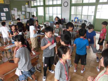 What’s do you like?の学習で,チャンツを歌ったり,チームに分かれて,好きな果物を聞き合ったりしました。(What’s fruit do you like?)答え方も学習し,簡単なやりとりができるようになりました。自分の好きなものを言ったり,相手に好きなものを聞いたりする活動に親しんでいました。