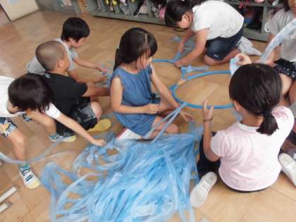 運動会「ゆらゆら クラゲリレー」でバトンの代わりになる『クラゲ』を2年生の子達が,せっせと作ってくれています。「かわいいクラゲにしたら,1年生もきっと喜んでくれるしな。」と友達と話していました。みんなの気持ちが通じ,きっと,かわいく楽しいリレーになることと思います。