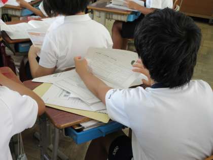各クラスでは,返却の際に解答を示しながら,自分はどこで力を発揮できていないのかを,一人一人が確認できるようにしています。全国で一律正解率の低い問題もあります。そこでは,どのような力が足りなかったのかなと,一つ一つ考えてみました。結果(点数)だけに目をとられるのではなく,どのような問題なのかをしっかり見てほしいと思います。