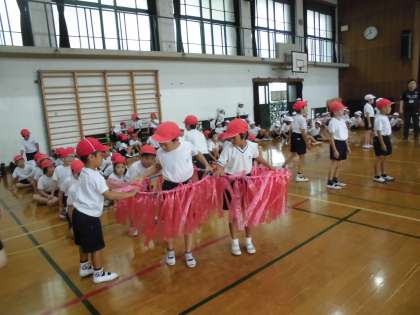 昨日から作っていたクラゲリレーのバトンが出来上がりました!今日も朝からみんながせっせとスズランテープをフラフープに巻いてくれました。そして,クラゲバトンの出来上がりです。早速,次の時間に1年生と一緒に「ゆらゆらクラゲリレー」の練習に使いました。まるで,双子のクラゲが仲良く走っているようで,とてもかわいらしいリレーになっています。」
