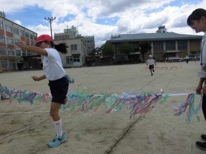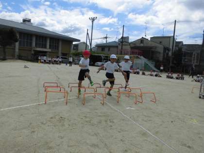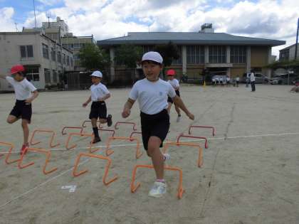 今日は,運動会の個人走80メートルそうと個人走「ジャンプ!ジャンプ!ジャンプ!」の練習をしました。80メートル走は,決められたコーナーを走ることが,少し難しいようですが,みんな一生懸命ゴールに向かって走っていました。「ジャンプ!ジャンプ!ジャンプ!」は,ケンケンパの後,ミニハードルをリズミカルに超え,ゴムをくぐり抜けてのゴールです。運動会まで,あと,11日!思いっきり自分の力を出してもらえるよう,練習に励んでいきたいと思います。