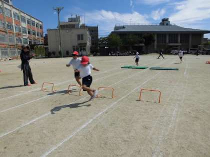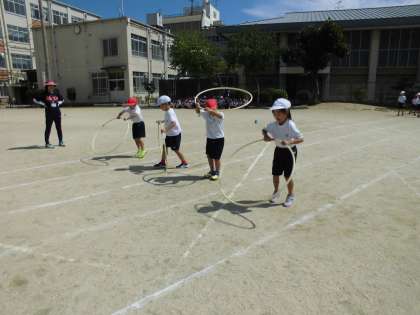 体育では,「とんで まわって ハイ!ジャンプ!」の練習をしました。まず,フラフープを3回跳びます。次にマットで前まわり。最後に小さなハードルを跳び超えます。