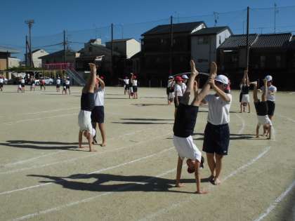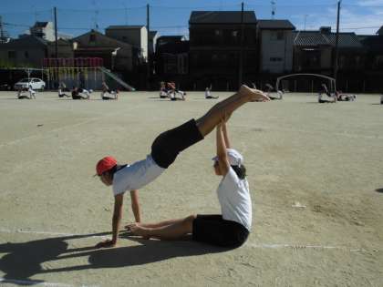 二人技では,息を合わせて技の完成に向けて頑張ってきました。どのペアも技の習得だけでなく,美しさも追求して本番目前となりました。運動会当日にこの練習の成果が発揮されるといいですね。