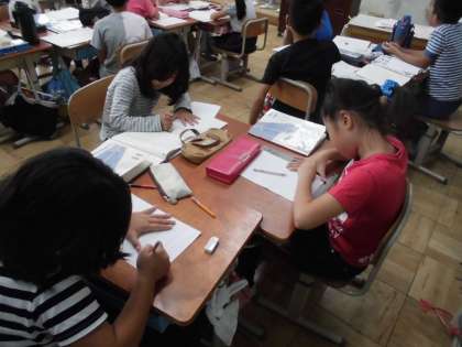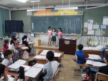 国語の「つたえよう,楽しい学校生活」の学習のしめくくりとして,発表会をしました。発表するときに気を付けることを前もってみんなで確かめた後,各グループで発表しました。友達の発表に聞き入っていました。ふりかえりは,「話し手」の立場と「聞き手」の立場からの二つの視点から書きました。