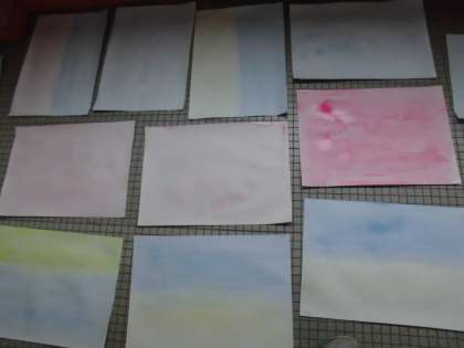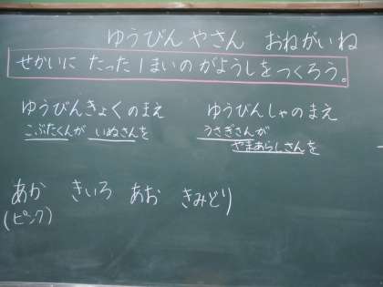 1年2組の図工「おはなしをえにしよう」では,サンドラ・ホーニング文,バレリー・ゴルバチョフ絵,なかがわちひろ訳の「ゆうびんやさん おねがいね」で取り組んでいます。今日は「世界にたった1枚の画用紙を作ろう」ということで,画用紙に刷毛で絵具を塗って自分だけの画用紙を作りました。個性豊かな画用紙ができあがりました。