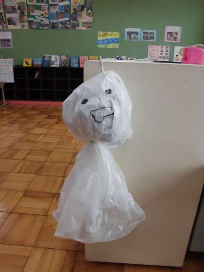 明日の運動会が予定通りに行えるように,3組では特大てるてるぼうずを作りました。
