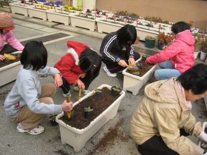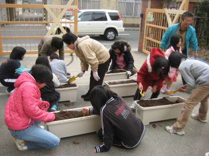今日の後半は,秋に蒔いたハナビシソウやデイジーなどの苗をプランターに植え替えました。プランターの土をほぐし,肥料を混ぜ,ポットの苗を植えていきます。子どもたちも手馴れたものです。1年間の成長を感じる時です。