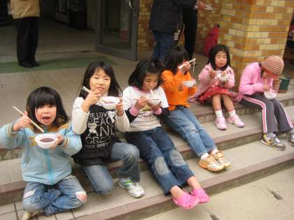 そして,今日のお楽しみは,なんと,地域の方からの差し入れのぜんざいです!やわらかいお餅の入った熱々のぜんざいをみんなでフーフーしながら食べました。おいしかったね。