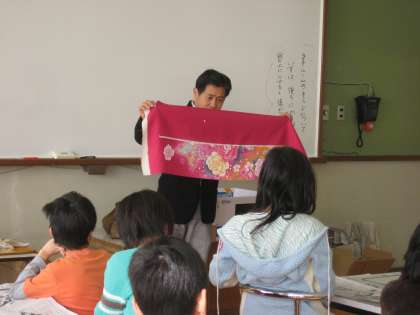 毎年お世話になっている地域の山本さんから友禅の歴史や染め方などのお話を聞いたあと,いよいよ友禅染の体験です。