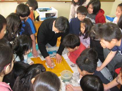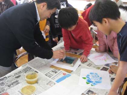 ハンカチの上にバラの型を置き,鹿の皮で作った刷毛で染料を塗っていきます。染料をたくさん付けてはいけません。刷毛の先にわずかに付けてやさしく円を描くようにすると,ぼかしがきれいに出来上がります。教わったとおり丁寧に丁寧に・・・みんなとっても上手です。染め上がったハンカチをあちらでもこちらでもうれしそうに見せ合っていました。