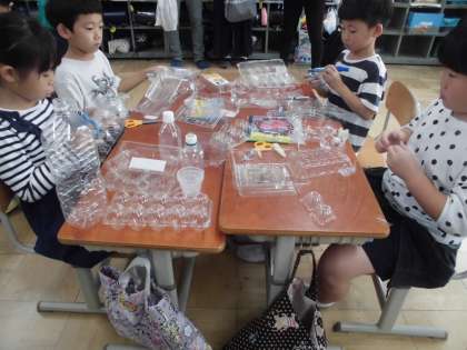 透明容器は,光を当ててみるととてもきらきらと輝いたり,写った影がまた形を変えたりします。そこで,そんな容器の特徴を基に,きらきら光るおもちゃ作りをしました。「恐竜を作るよ。」と初めからイメージをもって作っている子や作っている最中にどんどんアイディアが浮かんで楽しそうにお話しながら作ったりしている子など,みんなとても楽しそうでした。来週,作ったおもちゃに光を当てて遊ぶ予定です。