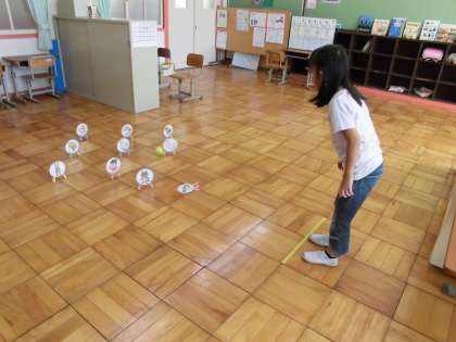 自立活動では,まっすぐに引いた線の上を歩く活動や,的に向かってボールを投げて的を倒すゲームをしています。上手にバランスを取って歩くことができていました。的当てゲームは,今は床に的を置いてボールを転がして当てていますが,机などに的を置いて,ボールを投げて的に当てる活動にも挑戦していきたいと思っています。