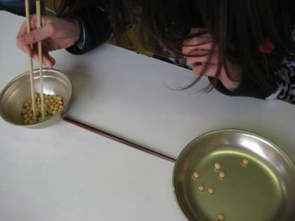 各クラスから選ばれた精鋭たちが一斉におはしで豆をつまみお皿に移します。優勝は6年生の女の子で,14個でした。