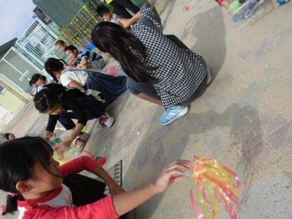 先週からの図工で,透明容器を組み合わせて動物や乗り物などを作っていました。そして,容器にマジックで色を塗って仕上げました。その容器を光に当てると,きらきらと光が反射します。今週は,曇り空が多かったのですが,今日は久々の快晴です。早速,外に出て光を通しました。