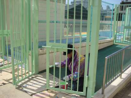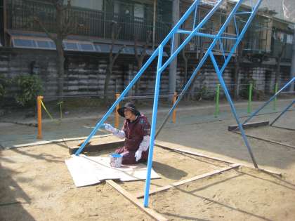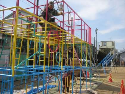 総合遊具はいよいよ仕上げ,下の段の色はスカイブルーです。すっかりお化粧直しが終わり,かわいい色の鮮やかな総合遊具が出現しました。その他,バスケットゴールやうんてい,鉄棒,プールの柵まで次々とお化粧直しをしていただき,運動場は一足早く春になったようです。