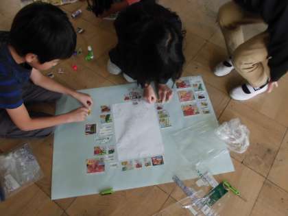 社会の学習で,食べ物の産地調べをしています。家から持ち寄った,ラベルや広告などを,白地図の周りに貼っていきます。普段自分たちが何気なく食べている食品がどこから来ているかをみんなで考えていきたいと思います。