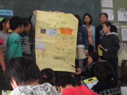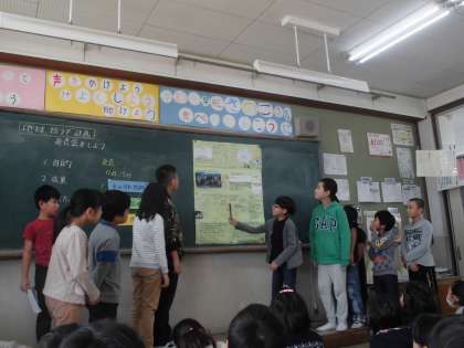 4年生は総合的な学習で「地球救うぞ計画」を立てて,水・ゴミ・温暖化の問題ごとのチームに分かれて調べ学習をしていました。いよいよ完成したものをみんなで発表して交流しました。