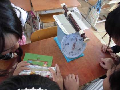 算数の「重さ」の学習で,はかりを使って身の回りの色々なものの重さをはかりました。「重い」「軽い」ではなく,自分達が使うはかりの一目もりは何グラムなのかを確認し,グループ全員が正確に目もりを読めるようにしていました。