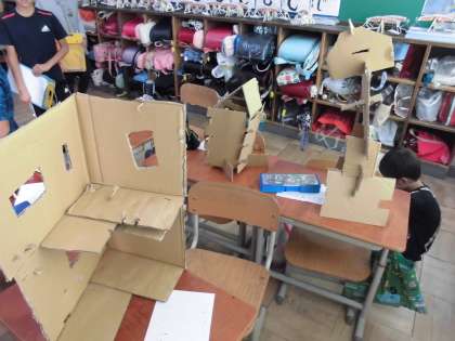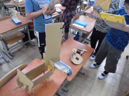 図工の「クミクミックス」の作品が出来上がり,お互いに鑑賞をしました。セロテープを使わずに,段ボールを組んで作品を作るというめあてに沿っているかという視点をもちながら,友達の作品のよいところを見つけていました。