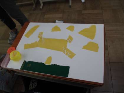 紙をやぶいてできる形から,何に見えるか考えて画用紙に貼っていきました。置き方や組み合わせ方,描き方を工夫して,思いついたことを表していきました。思いついた形を加えたり,パスで描き足したりして作り上げていきました。