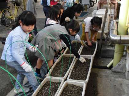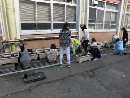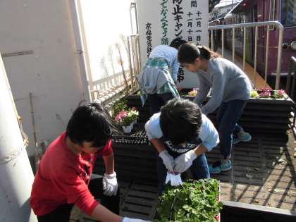 土曜学習後半は,みどりクラブで本校のエントランス,そして,嵐電西院駅の踏み切り横のプランターにお花を植えました。チューリップや金魚草などをはじめ何種類もの花をそれぞれ工夫しながら植え,最後の片付けまで手伝ってもらいました。