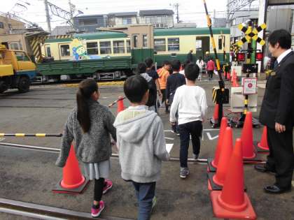 嵐電教室がありました。踏切の渡り方を教えていただいた後に,実際に嵐電に乗せていただき,四条大宮まで行きました。そこで,質問に答えていただきました。車庫に戻り,整備の様子を見せていただいたり,電車の下を見せていただいたりしました。普段はできない体験がたくさんでした。学んだことをもとに,これからの学習の進め方をみんなで話し合いましょう。