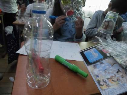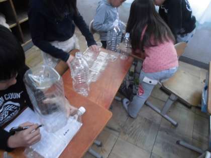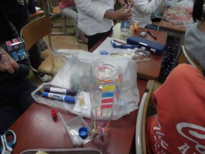 図工の時間に,「クリスタルファンタジー」という立体作品作りをしています。ペットボトルや透明なトレーなどを,これまた透明なセロテープでくっつけ,自分のアイデアを生かしてどんどん作っていました。完成したら,部屋を暗くして,ライトを当てて鑑賞したいと思います。