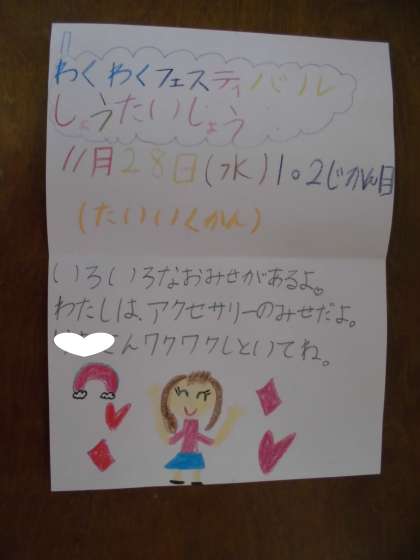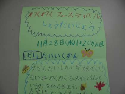 スキルタイムの時間に2年生が「わくわくフェスティバル」の招待状を持ってきてくれました。「わくわくフェスティバル」は,11月28日(水)の1・2時間目に体育館であります。