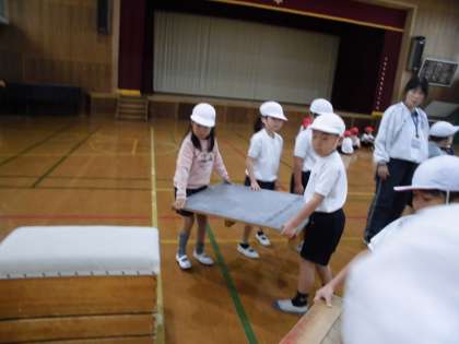 交流学習の体育では,「とびばこあそび」をしています。まずはじめに,学習の場づくりである用具の準備をみんなでします。交流学級の友達と一緒に準備することができています。