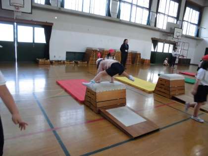 なかなかうまく跳び越えることができませんでしたが,手を前につくこと,手元ではなく前を見ること,大きく脚を開くことなどのアドバイスを受けて,徐々に上達してきています。まだまだ完成とはいきませんが,楽しんで練習しています。