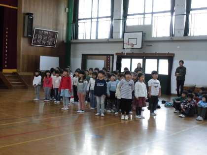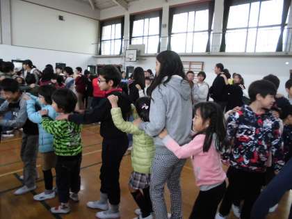 12月10日(月)13時30分から人権集会が体育館でありました。3組は1年と一緒に「やさしいことば」について発表しました。各学年の発表の後のゲームは「じゃんけん列車」でした。1年生は5年生とペアになって,自己紹介をし合い最後のペアの友達とじゃんけんをしてじゃんけん列車が始まりました。最後は長い長い1つの列になり,輪になって手をつなぎながら「てをつなごう」を合唱しました。歌詞のとおり,つないだ手の中があったかくなり,力がわいてきて,やさしい気持ちになりました。