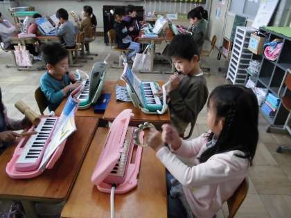 今日の音楽は,「どんぐりさんのおうち」と「きらきらぼし」を班で演奏しました。担当する楽器を話し合って決め,練習しました。3組の友達は,ウッドブロックに決まりました。練習の時は,鈴も演奏しました。友達と練習したり,友達の演奏を聴いたりしたことで,発表の時は音楽に合わせてリズムを刻むことができていました。