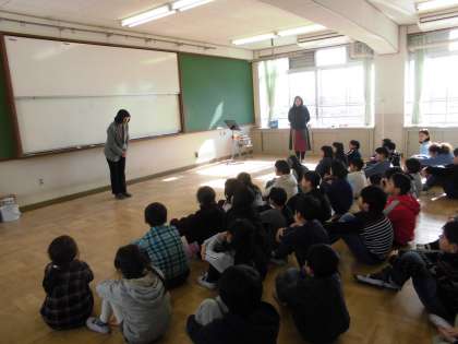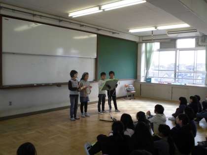 4年生は音楽科の学習でリズムを作る学習を行いました。今日は今までの学習のまとめとして,学年全員で「リズム発表会」を行いました。グループに分かれて作ったリズムの発表です。校長先生にも見ていただきました。
