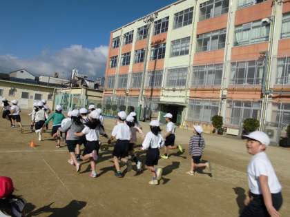 ゆっくりかけ足では,運動場のトラックを5分間走ります。できるでけ同じペースで走れるように練習しています。また,時間の中でたくさん走れるようにということも目指しています。3組さんもみんなと一緒に,5分間立ち止まることなく走り続けることができています。5分間で何週走れるかにも挑戦していきたいと思います。