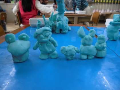 図工の「いっしょにおさんぽ」では,粘土を使って学習しました。まず自分を作り,一緒にお散歩している,動物や人などを作っていきました。最後に班ごとに作品を集めて配置し素敵な町のような風景ができあがりました。班ごとにできあがった作品は,みんなで鑑賞して,友達の作品のいいところなどを発表しました。