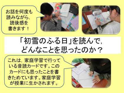 今回は,安房直子作品「初雪のふる日」を読んで行います。読んで思ったことや「不思議」について友達と出し合う中で,作品のおもしろさ感じてほしいと思っています。お互いの思いや考えを出し合うことを通して,一人では気が付かなかったことや考え方に触れることができたらいいなと思っています。