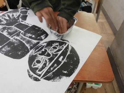 図工の紙版画が完成しました。インクをつけて刷るだけでも伸び伸びとした作品でしたが,そこにカップなどでスタンプを押しました。インクの黒に色どりが加わってさらによい作品になりました。次の時間には,お互いの作品のよいところを見付けていきます。