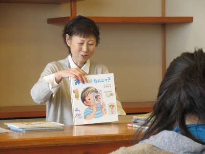 「絵本」というと小さい子ども,又は学校でいうと低学年が読むというイメージはありませんかと問われました。けっしてそうではないのです。「絵本」の世界は深いので,高学年でも,また大人でも十分楽しめるのです。また,「絵本」は文字を読むだけでなく,絵を読むこともできると言われました。読み聞かせをしてもらうことで,絵を楽しみながら,本の世界に入ることができるよさがあります。