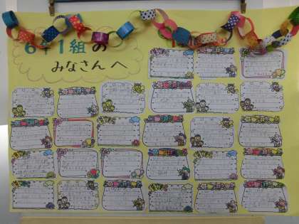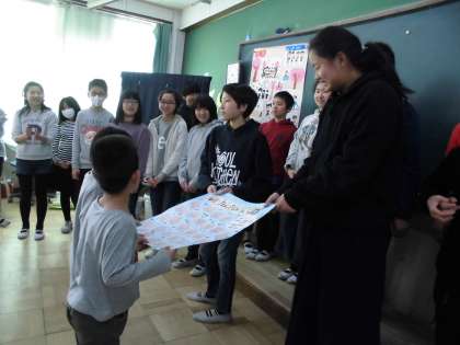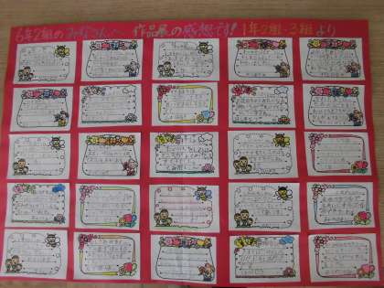 先週開催された校内作品展でアイビーペアの友達の作品を鑑賞して,メッセージを交換しました。3組のアイビーペアは2人なので,2つのメッセージを作りました。オルゴールは「桜の花びらがかわいい。」「校舎がかっこいい。」版画では「バックの黄色がきれいです。」,平和ポスターでは「いろいろな国の人がいるのがすごい」などの感想を伝えてくれました。